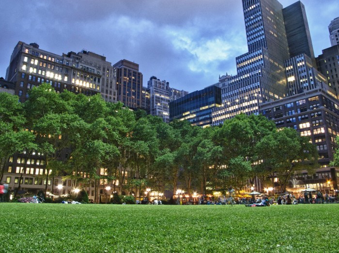 As the evenings get warmer, Bryant Park, located behind the NY Public Library, becomes a gathering place for lovers, strollers, and chess players.
