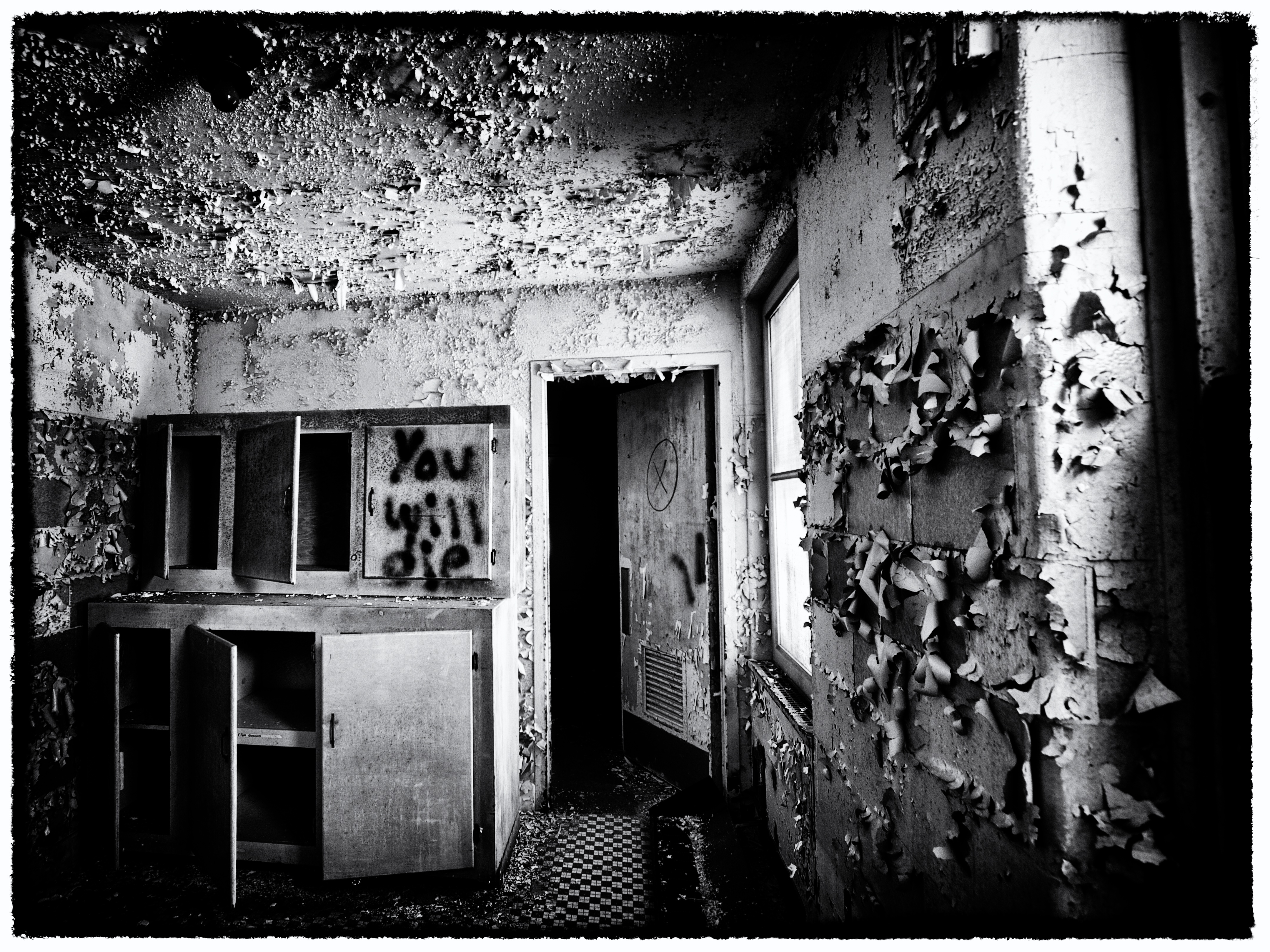 That’s the eerie graffiti I found in an old abandoned sanatorium on the Connecticut seaside. Which one do you like better: color or black&white?