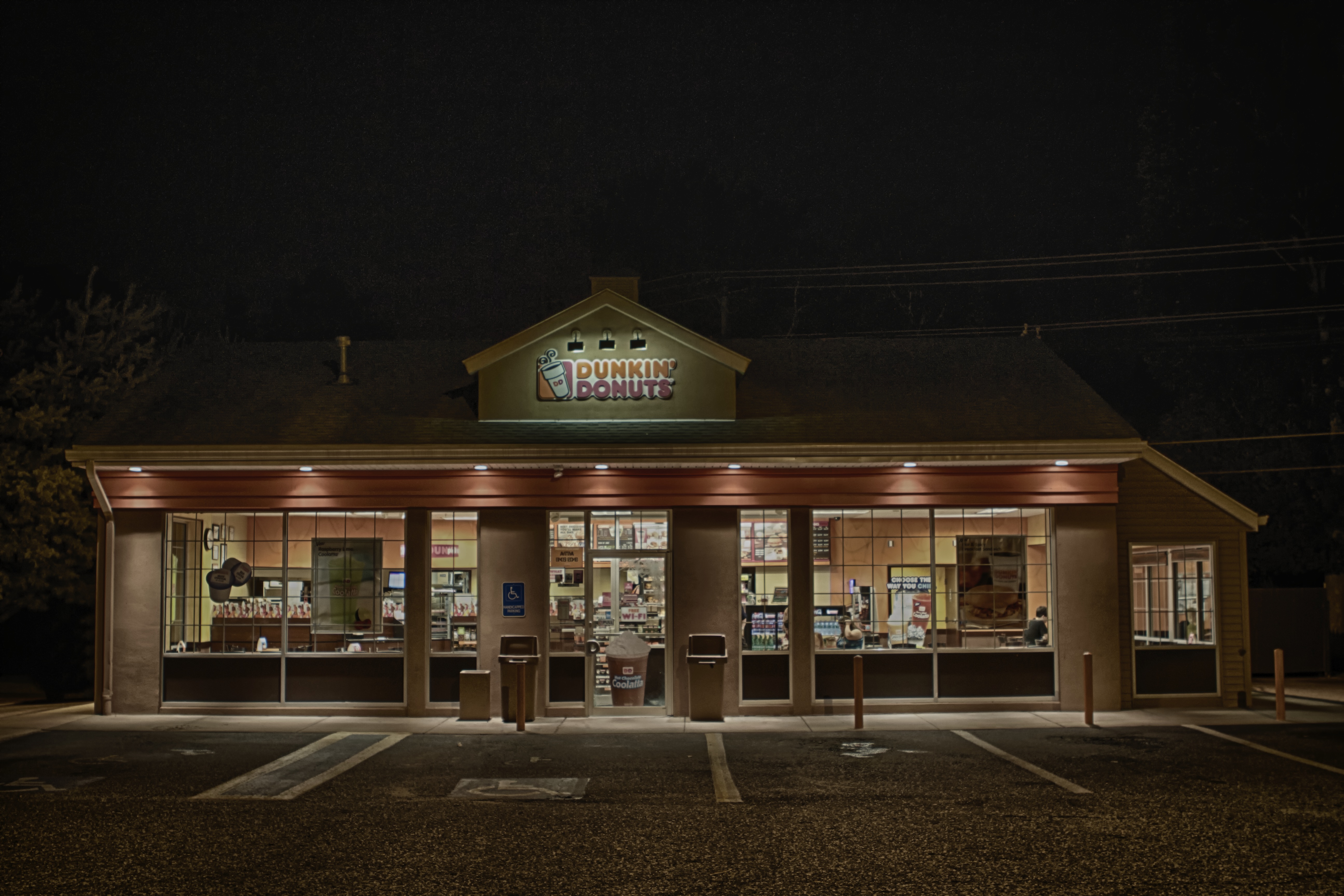 Found this Dunkin Donuts totally deserted at night, but still open. Seemed like a good location for a horror movie scene.
